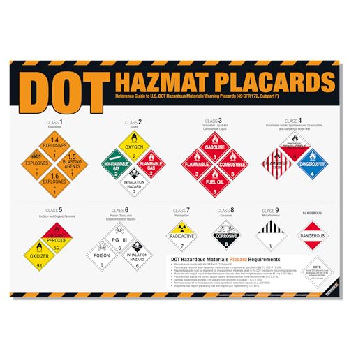 The DOT Hazmat Placards Poster is an essential tool for anyone involved in the transportation of hazardous materials. Covering all Class 1–9 placards required by 49 CFR 172 Subpart F, this poster enables seamless identification of hazardous materials, ensuring safety and compliance. Printed on durable, waterproof, and tear-resistant Polypropylene, it’s perfect for trucking operations and warehouses. Featuring clear visuals for explosives, flammable liquids, poisons, and more, it enhances safety awareness in various workplace settings. Ideal for HazMat training and emergency response education, this 18''x24'' guide is a must-have for shipping departments and compliance training centers to promote safety and efficiency.